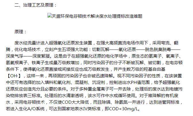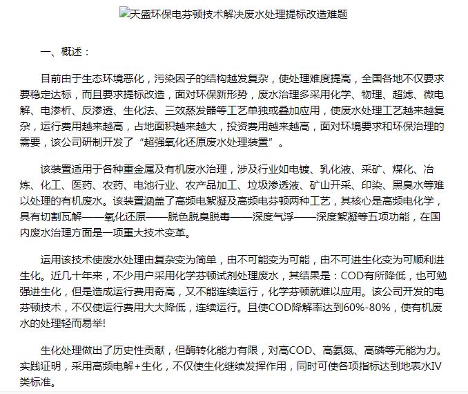 亚洲在线刊登:天盛环保电芬顿技术解决废水处理提标改造难题
