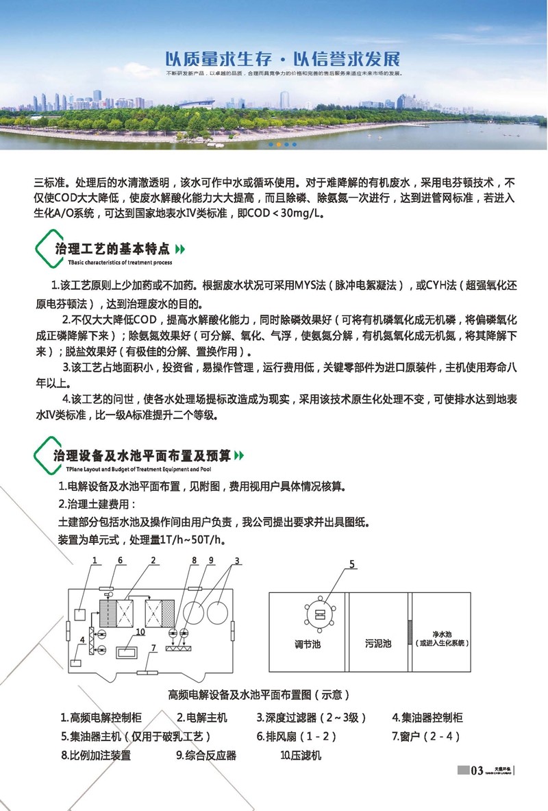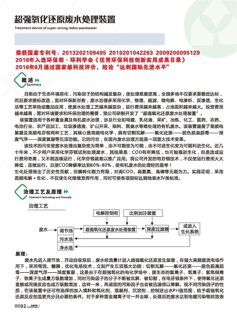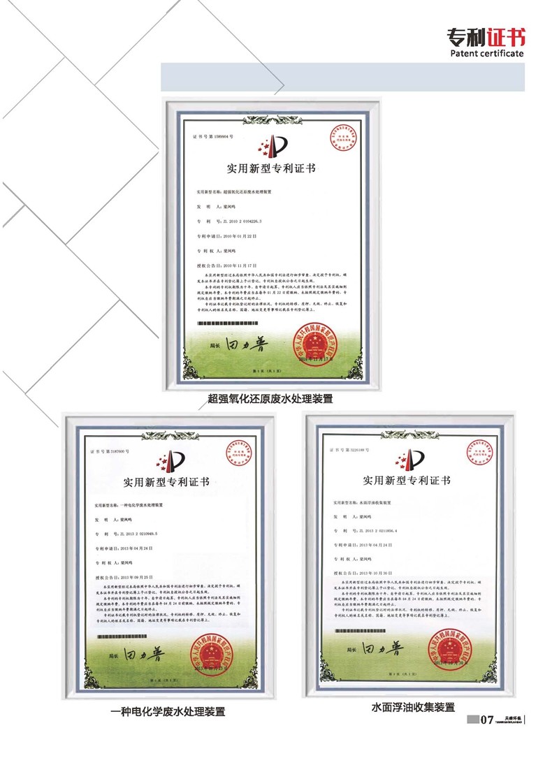 以治理废水为主,独立研制开发多种节能环保产品,已获多项国家发明及新型专利水面浮油收集装置 ZL 2013 2 0211856.4。公司坚持“以质量求生存、以信誉求发展、以市场为导向、以技术为依托”的宗旨,产品在国内以“技术新、性能好、价格廉”著称。